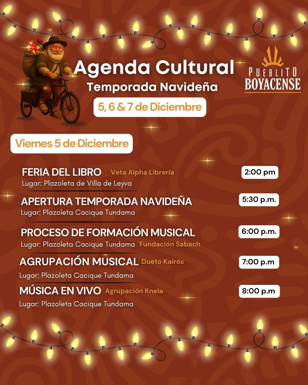 Del 5 al 7 de diciembre, Pueblito Boyacense se llena de luz, cultura y tradición para celebrar la Navidad con una programación especial pensada para toda la familia. El viernes 5 de diciembre iniciaremos con la Feria del Libro a las 2:00 p.m. en la Plazoleta de Villa de Leyva, seguida de la Apertura de la Temporada Navideña a las 5:30 p.m. en la Plazoleta Cacique Tundama. A las 6:00 p.m. se presentará el Proceso de Formación Musical de la Fundación Sabach, continuando a las 7:00 p.m. con la presentación del Dueto Kairós y finalizando a las 8:00 p.m. con música en vivo a cargo de la Agrupación Knela, todo en la Plazoleta Cacique Tundama.