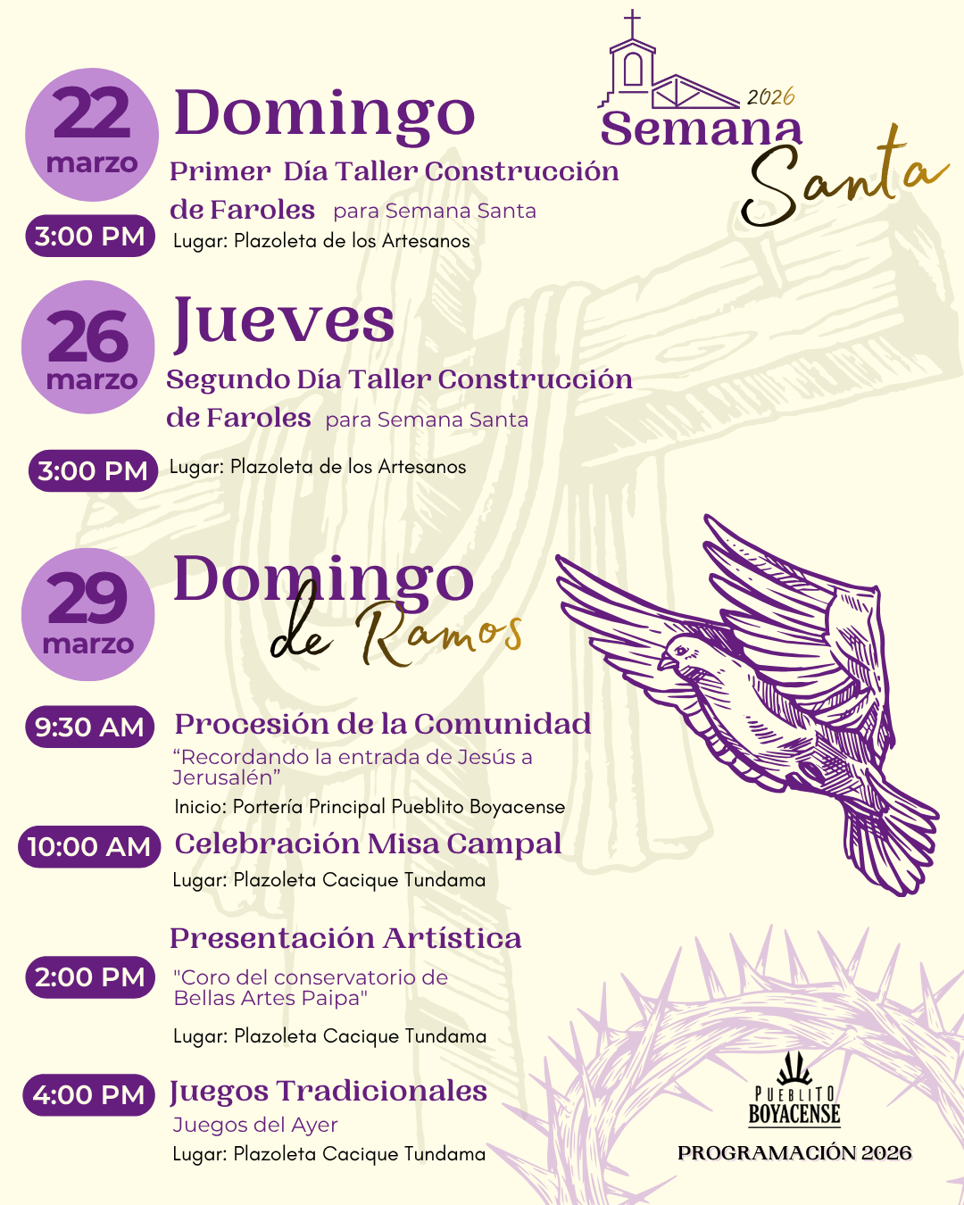 El domingo 29 de marzo, en el marco del Domingo de Ramos, se llevará a cabo la Procesión de la Comunidad, inspirada en la entrada de Jesús a Jerusalén, con inicio a las 9:30 a.m. desde la portería principal de Pueblito Boyacense.