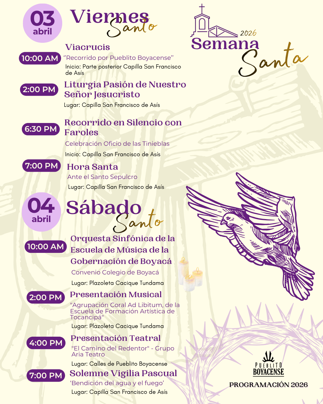 La programación de Semana Santa 2026 en Pueblito Boyacense continúa con actividades que integran la reflexión espiritual, la música, el arte y las expresiones culturales, consolidando espacios de participación para toda la comunidad.